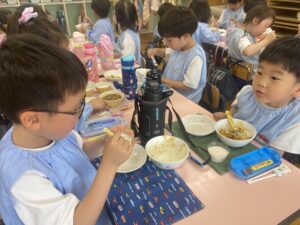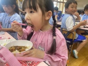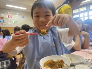 今日の給食は幼稚園で採れた玉ねぎがたっぷり入ったカレーでした♪